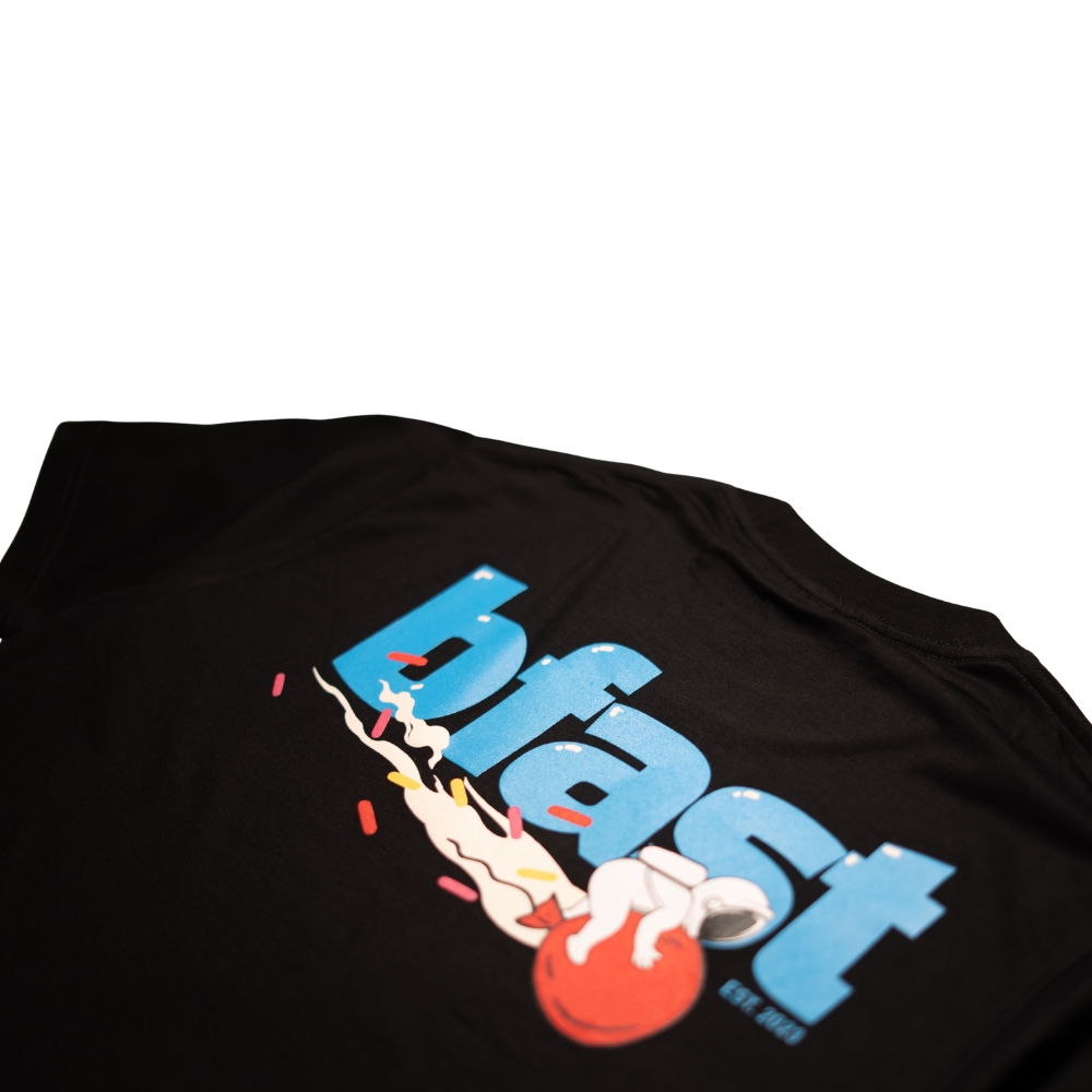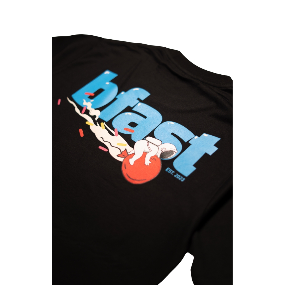 Our Birthday Cake tee keeps it clean from the front and loud from the back. Minimal embroidered BFAST logo on the chest, with a full graphic hit on the back featuring our astronaut design.
