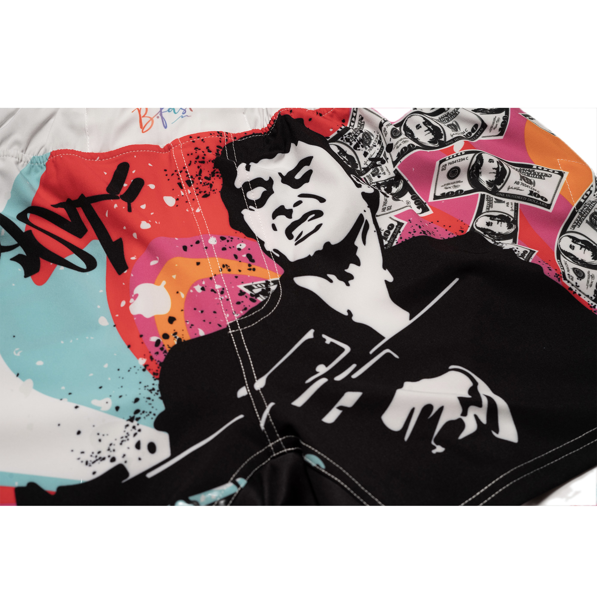 Make a bold statement in and out of the gym with these eye-catching fight shorts. Featuring a striking street-art design, the shorts showcase a high-contrast graphic of a fearless martial artist surrounded by flying money, graffiti accents, and the iconic phrase “The World Is Yours.” Vibrant splashes of color pop against a clean white base for an unmistakable, high-energy look.